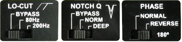 Notch Freq. range: 56Hz to 330Hz; Notch Q: Setting 1: -8dB; Setting 2: -15dB;