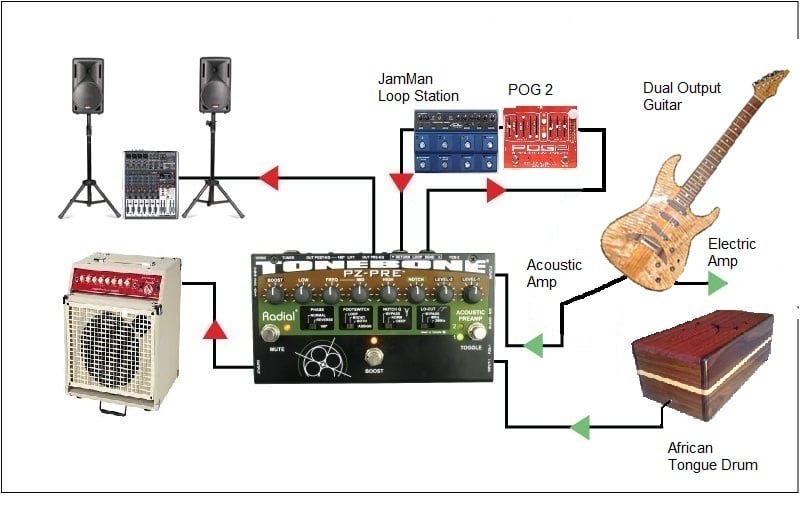 After our review of the very first African Tongue Drum with built in piezo-electric pickups, my challenge was to find a way to share that instrument with my custom dual output guitars through the same single channel SWR Strawberry Blonde acoustic guitar amplifier. However, an issue arose with the output signal between the drum and guitar which makes a simple splitter impractical. The tongue drum uses four passive piezo-electric pressure transducers, with no pre-amp; both my Guitar Factory and modified Carvin guitars have active piezo-electric systems, which include pre-amps. The difference in output voltages meant that I needed a two channel pre-amp that would allow for different sensitivity on the inputs while also having separate volume controls in order to balance the output signal of both instruments. I never really expected to find such a device when typing “dual channel acoustic guitar pre-amp” into Google, but when I did, I was absolutely stunned to discover the Radial Tonebone PZ-Pre Acoustic Instrument Pre-Amp. During my first bewildered glance, I noticed it was equipped with an arsenal of options, outputs, and features which are truly remarkable. I also quickly recognized that this would be the exact Pre-Amp I needed, and it came neatly packaged in a foot pedal design, meaning it could easily be integrated to my pedal board. My review of this dual channel pre-amp focuses on my favorite, and most often used features. Tonebone’s website has a detailed 6-page write up of all the features of this very capable and well equipped pedal, for those who wish to delve further.