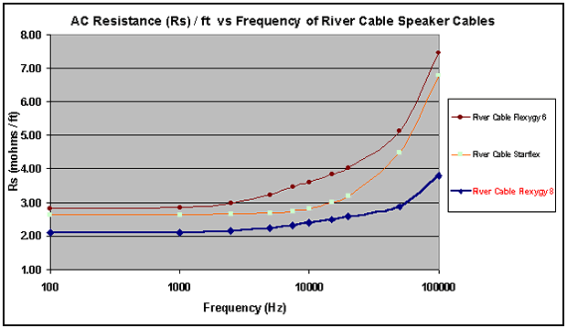 The resistance of the Flexygy 8 is about 10AWG equivalent at DC as specified by River Cable. To date, this is their lowest resistance speaker cable. We see a slight rising AC resistance with frequency (to the least degree on the Flexygy 8) attributed to skin effect, but practically speaking a non issue for the application of high fidelity audio.