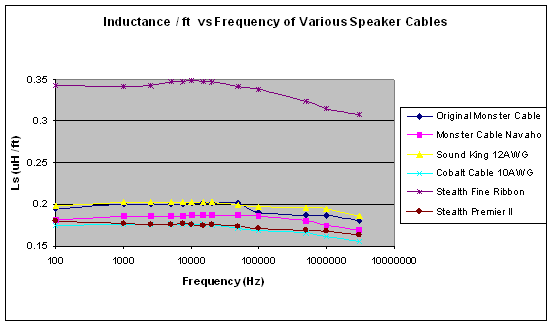 The Original Monster Cable seemed to prematurely lower in inductance at around 20-30 KHz. "This premature breakpoint is most likely due to inter-strand copper chloride build up from to the PVC insulation, causing a non skin-effect based current profile variation as a result of magnetic field variation within the conductor bundle." (John Escallier)