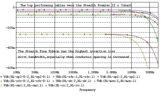 Note, the analysis used for skin effect in the previously mentioned article only applied to round conductors utilized in all of these cables except the Stealth Fine Ribbon. The flat ribbon cable employed in the Stealth Fine Ribbon utilizes a different Bessel function. However these calculations are beyond the scope of this article, and since there is no significantly measurable skin effect problem with these cables in the audio bandwidth, the exercise is mostly academic.