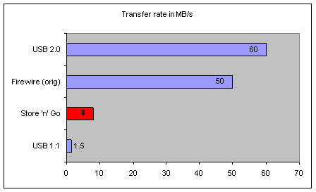 As you can see, transferring data with a USB 2.0 compatible flash drive is highly advantageous compared to USB 1.1 as it offers about 5 times the potential transfer speeds. The current batch of USB drives are not using the full potential of the USB 2.0 spec (due to typical ramp up time needed for the technology to eventually match the potential of the specification). I ran some various real world tests including the transfer of a fairly complex 500 MB set of files. The results are charted below: