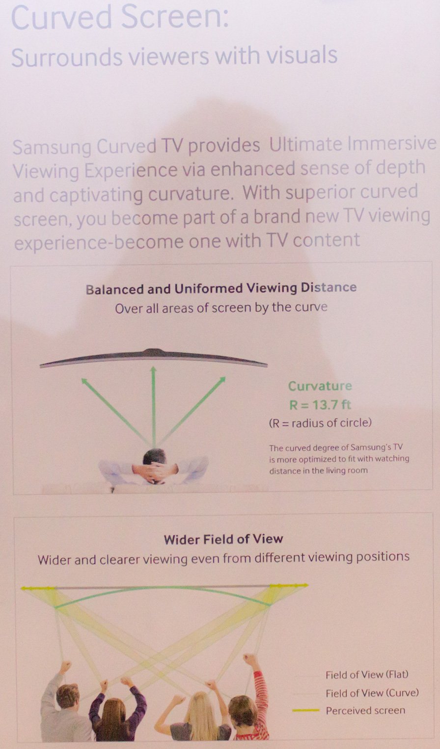Samsung presented this at CES 2015 this year to demonstrate the simple physics of how a curved display can improve the immersive quality of your next display. They say it's all about perspective; a flat screen makes images in the center appear larger where images on the edges of the screen are further away and appear smaller. The perspective argument (outlined below by Samsung) says this is corrected with a curved screen.