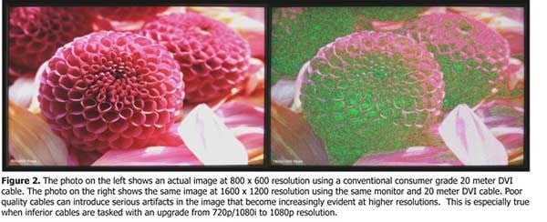While today's HDTV standards actually embrace a multiplicity of different display standards, the most common HD resolutions are known as 720p (1280 x 720 pixels @ 60 Hz refresh) and 1080i (1920 x 1080 pixels @ 30 Hz refresh). Where the "p" denotes a progressive (a.k.a. non-interlaced) scanning system and the "i" denotes an interlaced scanning system. Without delving too deeply into video theory it is sufficient to say that a progressive scanning system is superior to an interlaced system if the resolutions of both are the same. This is because certain artifacts cause a loss of vertical resolution in interlaced scanning systems, particularly if there is vertical motion (e.g. movie credits that scroll up the screen). There is much debate between video enthusiasts as to which of these two formats is "better" -- 720p because of its inherently stable progressive scanning system or 1080i with its ostensibly higher resolution. While these two formats have fundamental differences, they have one surprising thing in common - they require the exact same amount of bandwidth. This is because both systems use a pixel clock frequency of 74.25 MHz in the analog domain. In the digital domain, DVI and HDMI signals based on these resolutions have a bit rate of 742.5 Mbit/sec. (see Figure 1).