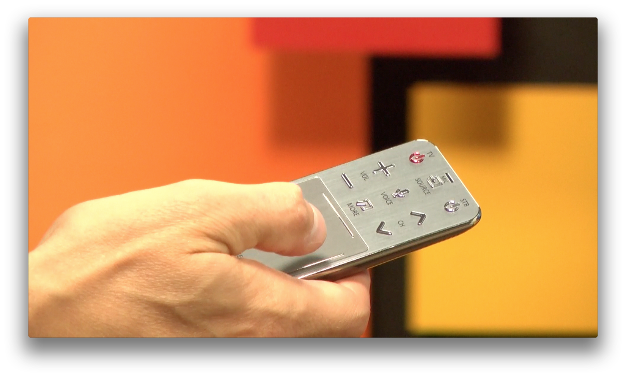 But it kind of has to be better, because this Smart Touch remote control... Well, it has a beautifully responsive touch interface and a minimalistic backlit set of buttons. It gets the job done, but ergonomics were not on the menu apparently, because you're going to find yourself swiping and tapping a lot to get to even basic features. For example, the Samsung takes over my DISH Network Guide, so if I want to use the better one that comes with the DISH Hopper that I have connected, I need to bring up the on-screen More remote on the Samsung and use that guide button.