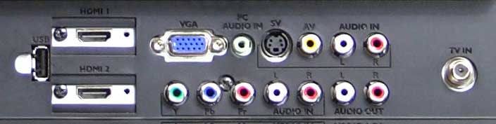 Since the unit uses a standard CCFL backlight system, it's just over 2-1/2 inches thick - hardly thin by today's standards, but still easily wall-mounted or placed just about anywhere. The set is rated for 50,000 hours of use - a good long life span to be sure - and it puts out a peak brightness of 400 cd/m2. Most of the inputs are rear-mounted, but the left side of the TV also provides access to an additional HDMI port, a headphone (labeled "earphone") jack, and a S/PDIF digital audio output. Rear inputs include 2 HDMI inputs, VGA, component, composite, S-video, coaxial cableTV and associated stereo analogue audio. There is also a USB input for streaming stored audio files.