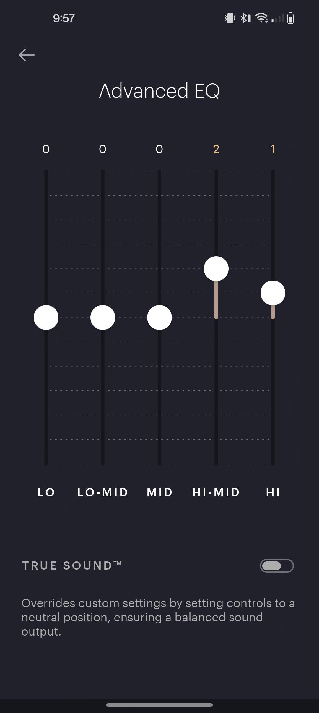 The Pi8 unlocks a solid 5-band EQ with the same +/- 6-dB in the Music app. It’s a significant upgrade for the Music app, which will hopefully become standard for future Bowers & Wilkins wireless products. Once you set levels on the 5-band EQ, one tap lets you activate “True Sound,” to bypass EQ altogether and restore the default tuning. It would have been nice if the Music app allowed a programmable touch control to toggle True Sound on/off so I can easily make direct sound-quality comparisons as I tinker with the EQ on Pi8. Even more annoyingly absent from the Music App are any savable EQ presets or built-in EQ profiles from Bowers & Wilkins. The Music app is not exactly a tinker's delight.