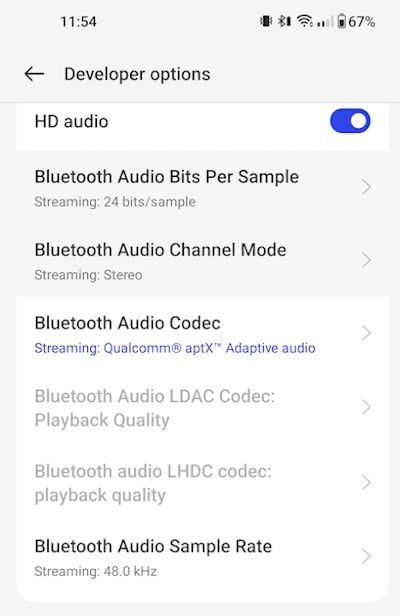 3/ Check the active Bluetooth Audio Codec to ensure it’s using Qualcomm aptX Adaptive or aptX HD.