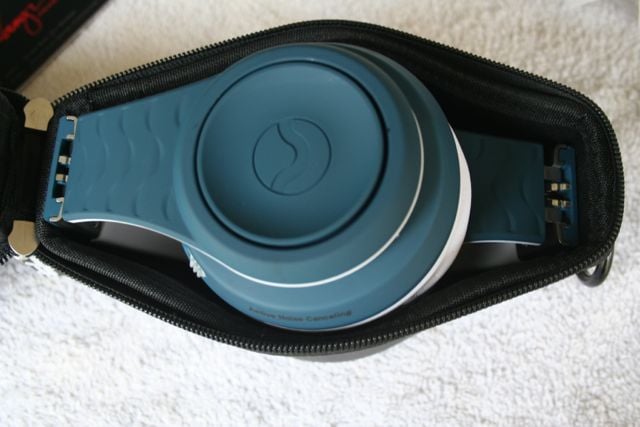 The action on the band as you adjust the headphones is mostly smooth with the normal tell-tale clicks as you pull it out. When fully extended, there is a louder click and it does take a bit more effort to reverse. On the left can, there is a removable plate that covers the battery compartment. The cover is secured by a short strip of fabric so that it doesn't fall off when you remove it and roll under the seat in front of you (a thoughtful inclusion).
