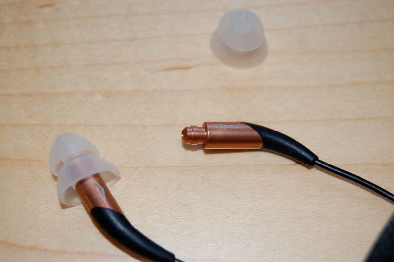There are five pairs of different sized contour ear gels. These translucent gels are designed to form an accurate seal inside the human ear canal that results in increased bass response and great noise isolation. They are translucent, washable, and you are bound to find the right fit for your ears. They look like little mushrooms, and two of the sets are what I would call a "double-mushroom" design that incorporates dual flanges. Included are small medium and large gels, and through the Klipsch website you can order extra-small if needed. It is simple to pop them on and off of the earphones, but as a result of a patent-pending design, the nozzles prevent the tips from getting lodged in your ear. So they come off when you need to change them, but not in your ear! Klipsch also includes a tool for cleaning the ear gels.