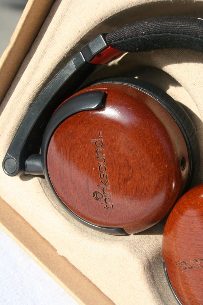 The thinksound On1 headphones have wood earcups with memory foam earpads. The wood earcups are supposed to be handcrafted for more accurate sound reproduction. Now, a quick glance at the sentence makes is sound like each earcup is carved by hand but, more likely, the original model was crafted by hand and the rest were carved by machines. I often deconstruct such sentences (my favorite is "Designed in the USA" as if to suggest that it is manufactured and assembled anywhere other than China) and assume the worst. The fact remains, however, that the earcup is real wood and is absolutely gorgeous. They are smooth to the touch but still have that feel of real wood. The have a nice coat of lacquer and the thinksound name is etched into each side.
