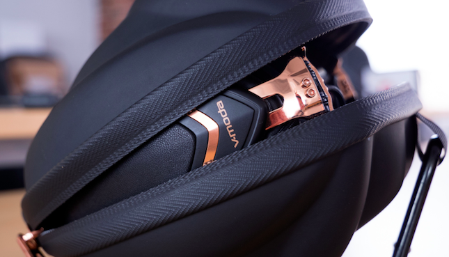 The earcups fold vertically into the headband, solidly snapping into place and fit into a stunningly beautiful clamshell case. The case includes an aluminum carabiner, that’s one of those D-shaped hooks so you can connect your carrying case to onto almost anything. Opening the rose-gold accented clamshell case may garner some curiosity as it looks like nothing else. Removing the headphones then extended the earcups with an audible metallic snap is an operation that is sure to bring great joy when performed with the panache of popped cuff links. Yes, V-MODA is truly a gift to the style conscious.