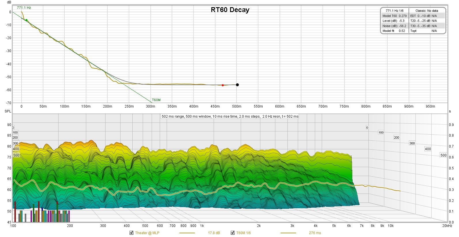 The RT 60 decay measurement below was taken in the AH Smarthome theater room with the front speakers and subs playing at the main listening position. Notice how linear the response is for the entire bandwidth. The acoustical treatments in this room are furnished by Sonitus.