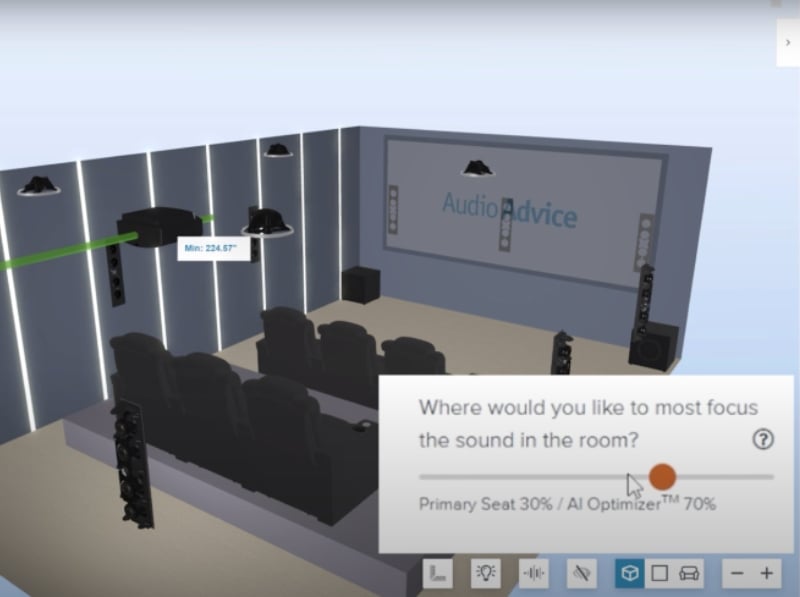 One of the biggest challenges in theater design is to strike a balance between a layout that delivers absolutely perfect results in the main listening position and one that maximizes the performance across all seats. Audio Advice’s proprietary AI algorithm addresses this in a unique way, and you can visualize the sonic results of your setup by turning on the sound dispersion button. According to Audio Advice, “Most people will want to shift as far to AI optimized as possible until just before speakers turn orange to achieve the best performance for all seats while still 100% in Dolby spec for the primary listening position.”