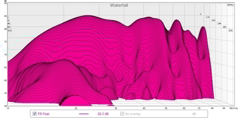 To illustrate ringing in a waterfall graph, here is a measurement at my primary listening seat with just one subwoofer playing with NO EQ.