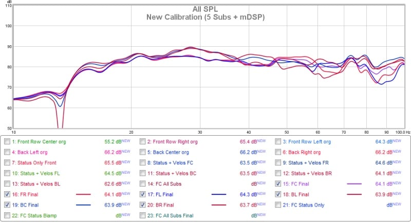In addition, mDSP enabled me to flatten the peaks below 40Hz for better management of the dominate room modes. We have leveled the playing field. Also notice the 80Hz dip in the front row was significantly reduced with the 5th sub added. Without mDSP, I wouldn't have been able to do this. The independent adjustment of delay and crossover slope in the mDSP device afforded me this luxury. We now have a bass response from 15Hz to 100Hz +/-8dB across all six seats and this is done with NO added passive bass trapping!