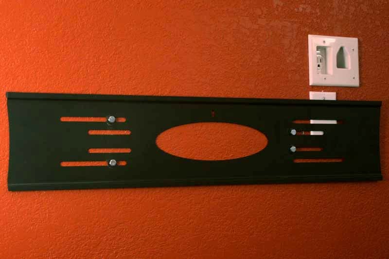 In our installation we needed to put the TV overtop of where an old outlet had been positioned. We opted to place a blank plate over the outlet and mount the rear plate so that it covered the plate. This wasn't a big problem since we had four very strong anchor points for the plate and everything still fit fairly flush to the wall. In a normal installation (where someone didn't attempt to "helpful" by adding power in the wrong place) you would add your own power afterwards - as we did later.