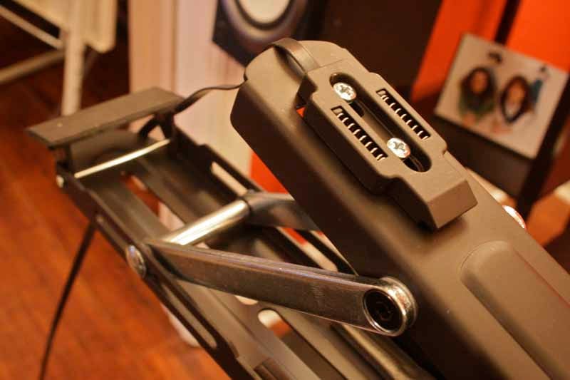 We next attached the brackets to the TV, making sure that the spring tension bolts were positioned towards the outside of the TV so we could get to them later with the supplied tension adjustment wrench. The correct screws and even the required spacers were included in the kit and it was a simple matter to get everything assembled. About the only hang-up was when one of the screws wanted to be located right underneath one of the pivot points of the arms. Pulling the tilt mechanism outward, shifted that pivot point and granted us access to the screw hole. It was almost a pleasure to work with this mount.