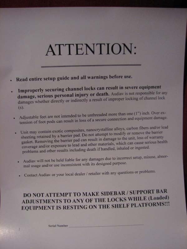 Inspecting the design of this rack, I noted how inert the shelves were. They made a thud sound when I tapped on them. The columns had a bit of a hollow sound to them, but Audiav claims you can mass load them if you desire. I didn’t take that additional measure as I didn’t have lead shot or dry sand to take advantage of it. The side rails also had a hollow sonic signature when tapped. I was surprised Audiav didn’t do more to deaden them, but considering that the shelving system is very inert and floating on the rack framing, this is probably a minor concern at best. Also mass loading the columns at the factory would lead to higher shipping which is not in the best interest of the manufacturer or consumer. In speaking with Audiav about this, they informed me that they do offer fascia kits which can reduce the "hollow" sound should that be a concern.