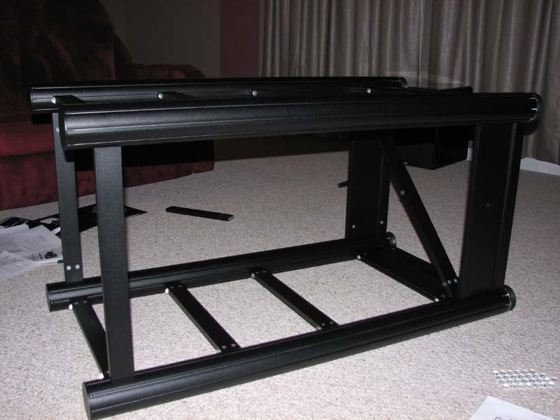 Getting that cross member system in place (far left pic) was perhaps the most challenging aspect of this assembly, but it was a well needed measure as I planned to stack some pretty hefty gear on this rack. With the ability to hold over 400lbs on the top shelf, 300 lbs on the bottom shelf, and over 80lbs on each subsequent shelf, I can rest well at night knowing that the Audiav A/V rack can safely house pretty much any conceivable piece of AV gear I fathom to place on it. Over the course of the next few months, I will put it to the test and report my results in subsequent reviews.