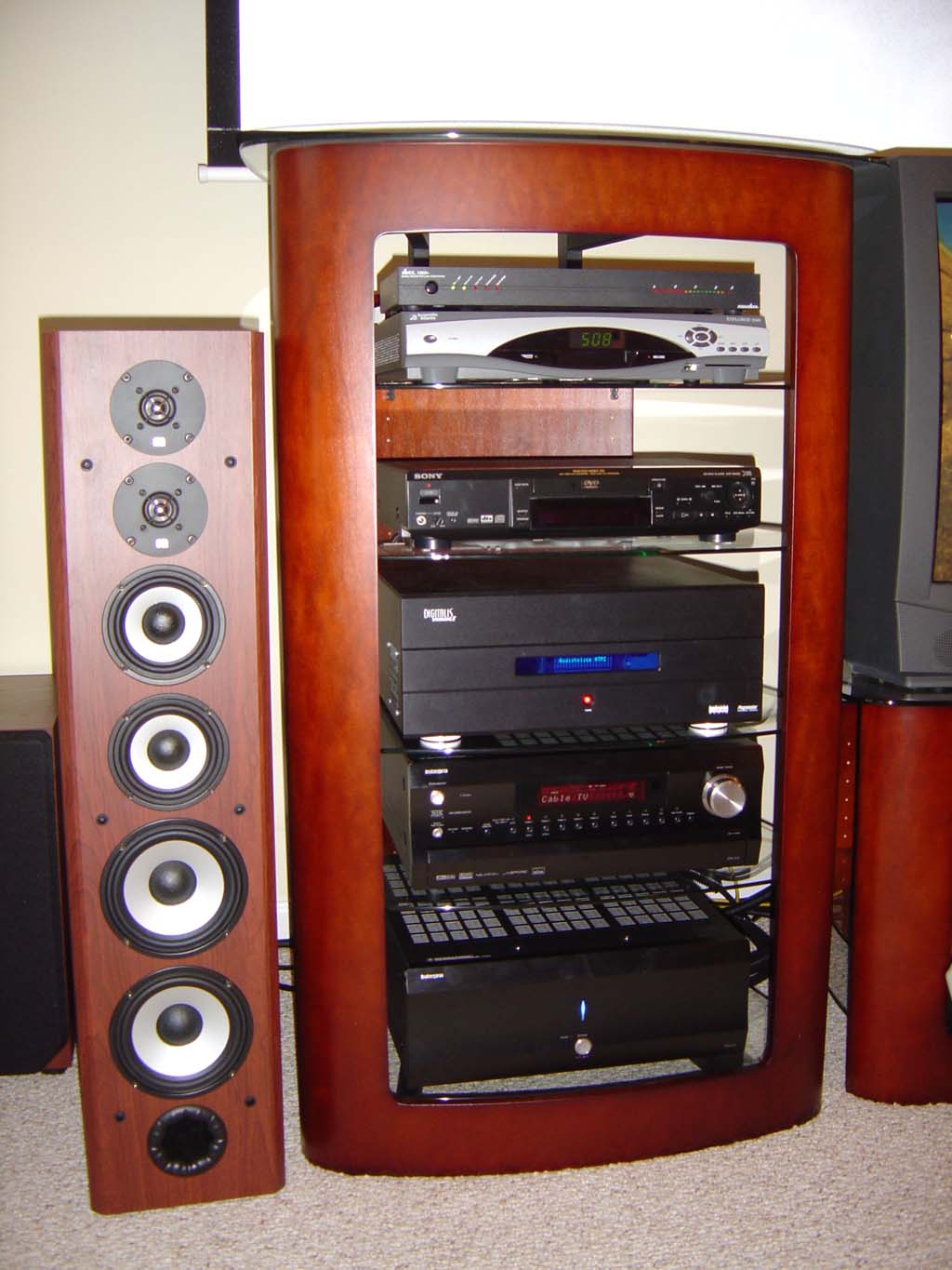 There's nothing like real wood to make your home theater system look like as good as it sounds. The curved front face of the BDI Axis furniture holds the Cognac stain beautifully and my samples came without any noticeable flaws whatsoever. One of the units is pictured here at the right, and I hate to say it, but it actually makes my Axiom speaker's finish look pale in comparison.
