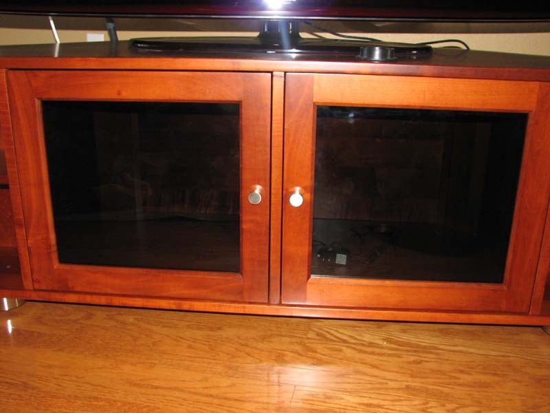 The Angle comes standard with clear glass doors but they also shipped me their upgrade glass tint and speaker grill covers. They also offer wood panels for the doors which I don’t recommend unless you are using an IR repeater system to control your equipment. I installed the tinted glass in the doors because they looked fabulous.