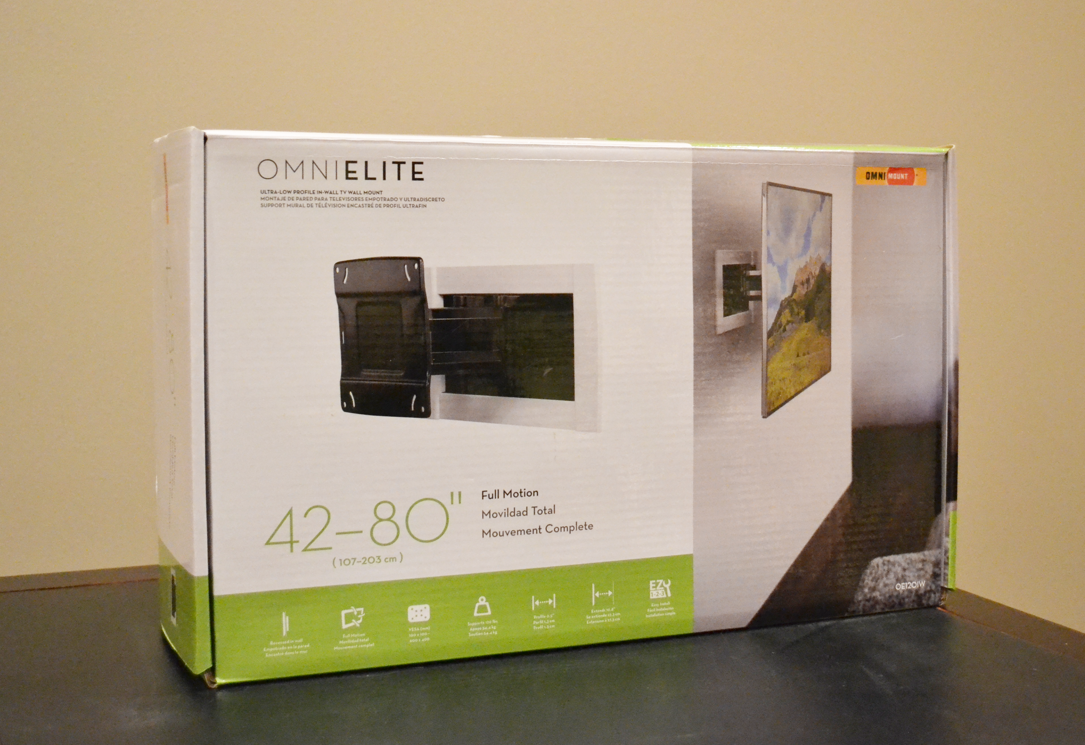 The OE120IW is a full-motion mount with a maximum extension of 10.75”. When pushed back against the wall, it has a nearly unbeatable .5” profile. This is possible thanks to a recessed box that the arm collapses into. AT 14.5” wide, the box fits right between standard 16” on center studs. The OE120IW works with TVs up to 120lbs, 42-80”, and with a standard VESA bolt pattern between 200x200mm and 600x400mm, meaning it will fit pretty much any TV on the market. With an MSRP of $349.95, it might seem spendy compared to bargain mounts found on Amazon, but it’s quite affordable when compared to similar mounts from the competition.
