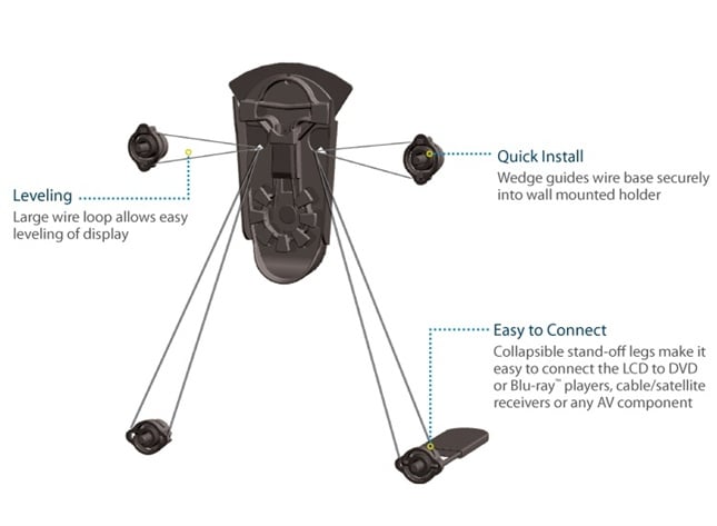 The "V" shaped mount back plate is only 6 by 3 inches and mounts to a wall stud. The flat panel anchors are mounted to the back of the display and the excess cable is pulled tight and wrapped around the adapter's teeth. That adapter is then snapped into the back plate. There is a locking screw to hold the adapter and back plate together. There is a small kickstand on one of the bottom anchors that can be extended up to 4.28 inches so that you can access the inputs on the back of the display.