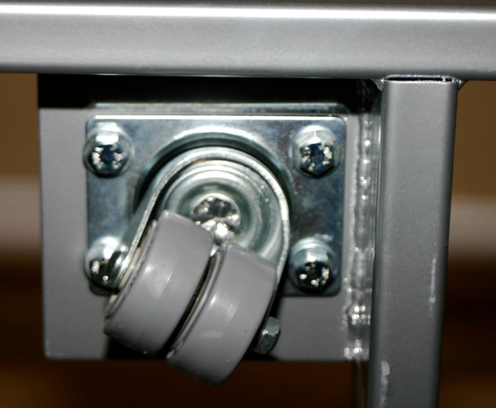I left the instructions to Walk, and he had everything laid out for me as I handed him the big pieces. In no time, we had the casters, each with hard rubber double wheels, bolted into place on the bottom steel frame.