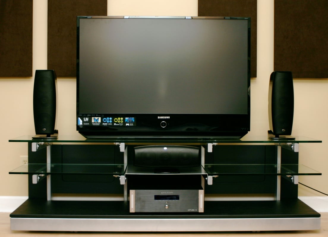 I checked the clock, and found that the entire assembly process took about 2 and a half hours. Not bad considering how impressive this stand is, and how heavy duty all the pieces are. I couldn't wait to load it up, so I immediately moved the Samsung 46" HL-S4676S Slim DLP HDTV I have been using recently onto the stand, and flanked it with some NHT Verve Large speakers. The horizontal center channel fit easily in the center middle shelf and looked great. I then put my Rotel receiver and DVD player in place, and just for kicks put an Emotiva IPS-1 amp and MMC-1 processor in place opposite the Rotel gear.