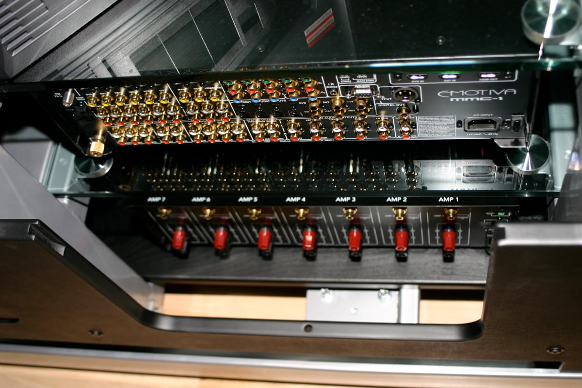 Worried that my Rotel receiver might push the 50 pound weight limit of the middle glass shelf (it didn't - I later checked and it was only about 40 lbs.), I put it on the bottom (wooden) shelf. The rear cutout does not extend quite low enough to get to all of the connectors easily. This is a minor complaint, as there is enough depth to the shelf that I still had a decent amount of room to work with. On the other side of the rack, I had the beastly IPS-1 amp on the bottom shelf, and there was no problem accessing the speaker terminals and inputs. On the middle shelf the MMC-1 pre/pro was in perfect position for easy access to the multitudes of inputs and outputs, and I imagine most people will either follow this scenario or position their receiver on the middle shelf too.