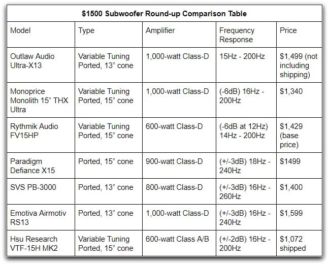 There is a lot of competition in the subwoofer market in this price range, and there are many good choices. If your subwoofer budget lies in this range and you are having trouble choosing which one to buy, another alternative, and in many ways, a superior alternative, is to buy multiple less expensive subs. With optimal placement spaced out in the room, multiple subs will smooth out the frequency response much more than a single subwoofer, and the most important parameter of sound quality in bass frequencies is a smooth response. Something else to consider is to pick a sub among these and plan to add another later. However, if you only have room for one subwoofer, and you only have $1,300 to $1,500 for a sub, we do hope that we have narrowed down the list of choices for you in this article.