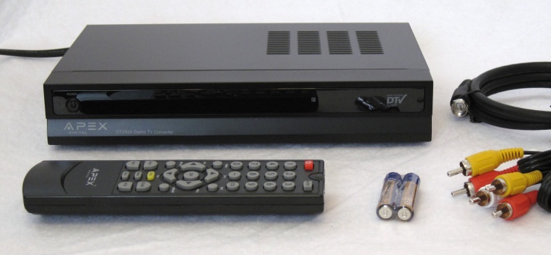 In an effort to stay true to the purpose of the low cost digital tuners which are government coupon compatible, the majority of the testing was done with a 7 year old, 20" CRT television. This RCA brand TV has coax, composite, and S-Video inputs. It isn't a particularly fantastic display, nor is it the worst available, but it did provide for a reliable visual comparison. A 20" flat-panel Dell computer monitor with composite and S-video was also used. The Dell doesn't have a great scaler, but worked nicely to expose any flaws in the picture that might have been hidden by our standard interlaced CRT. Please note that screen shots of menus, guides and info pages were also taken from the LCD monitor due to glare and moiré issues with the camera. We used two antennas to round out our signal comparison. First, we chose a basic, low-cost unit from Radio Shack that should be similar to basic rabbit ears that anyone is likely to already own. Second, we found a smart antenna at Best Buy, the Apex SM550, which works as a standalone amplified antenna or as a smart antenna. A smart antenna, as defined by the Consumer Electronics Association (CEA-909), is basically an antenna that can be controlled via the tuner to allow automatic tuning for the best possible signal. There were only a handful of smart antennas available online and this is the only one to be found at any local store. The smart antenna idea is very intriguing and we wanted to know how much of a difference it could really make. A basic set of shielded RCA and S-Video cables were used to eliminate any issues from the cheap cables included with the tuners. The following five TV converter boxes were tested: RCA DTA800B1, Insignia NS-DXA1-APT aka Zenith DTT901, Digital Stream DTX9950, Apex Digital DT250A, and Channel Master CM-7000. On to the reviews…
