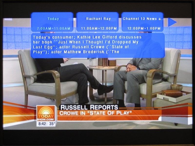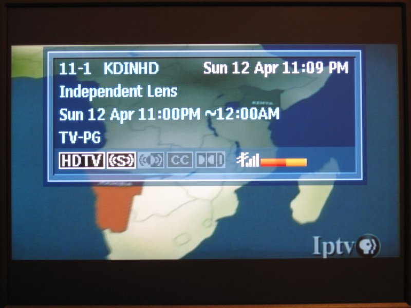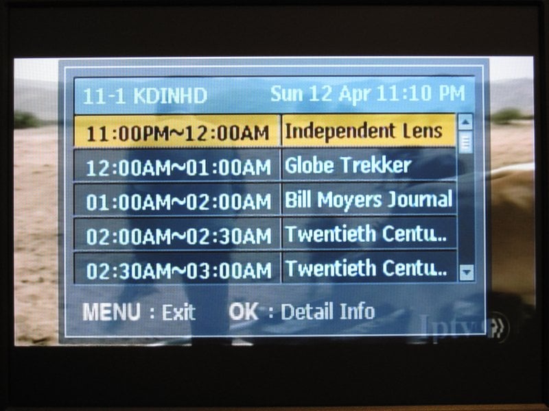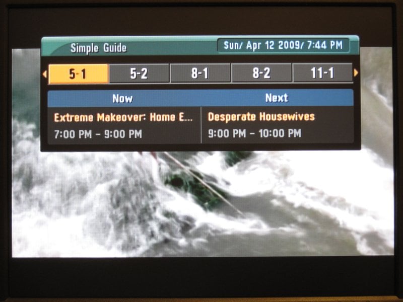 The program guide also takes a lot of screen space, but seemed easy to use and fairly complete. The current time is displayed as well as the current program title and time range as well as the next program. Five channel numbers are shown at the top and can be easily scrolled through to find what's on next or on other channels and hitting the enter button tunes to the new channel. Once again, it would have been nice to have the background be translucent, but it wasn't.