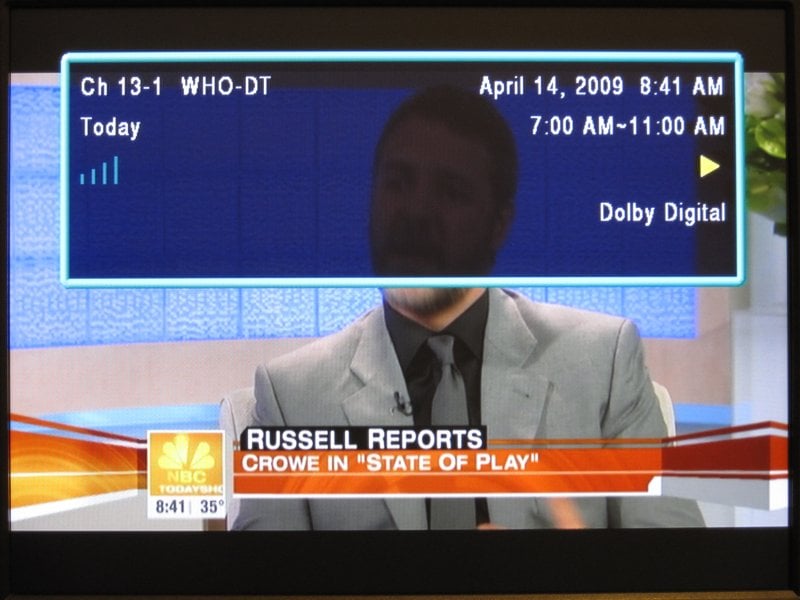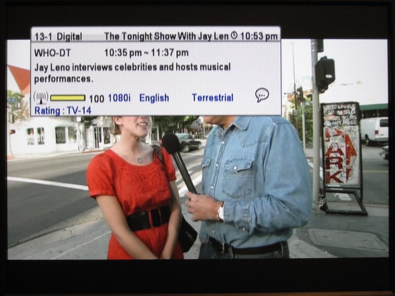 The Info button brought up a very nice, semi-translucent info screen with a lot of information. The Program Title, name of next program, signal meter, time range for current show, rating, channel number and call sign, and the current time were all included. An additional click of the Info button added a text window with the full program description. Everything was easy to read and not distracting from the actual video material behind it.