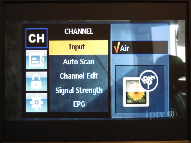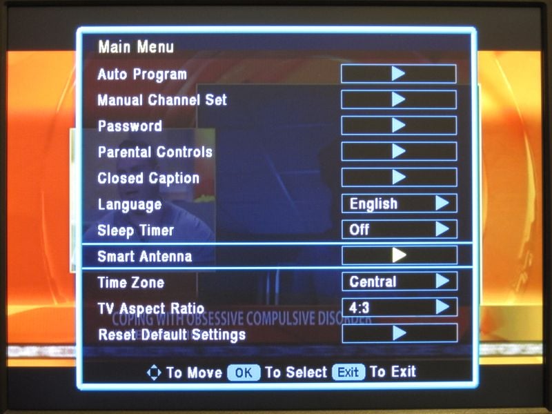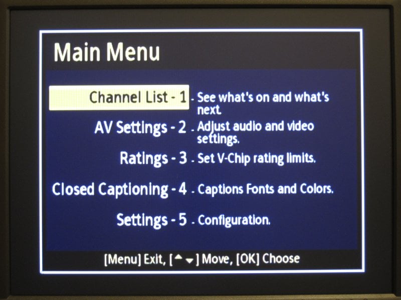 This is where the Channel Master really starts to shine. The main menu system has some nice icons and an easy to use layout. There are a lot of options, so it may be intimidating for beginners, but the seasoned channel surfer will be right at home. There are options for manually setting channels, favorite channels, rescanning channels, clock with auto & manual settings (and time zone), auto power down with optional warnings, an extensive CC setup, and rating controls for parents. The menu is easy to read. In fact, even though it has a smaller font there was no flickering of the text at all.