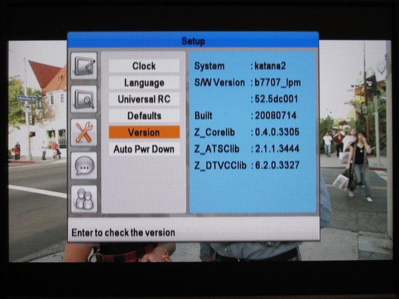 The Main Menu had four settings labeled Channel, Caption, Rating and Function. The Channel menu allows for channel rescanning as well as manual channel editing and setting up favorite channels. The Caption menu had many settings for changing the fonts, colors, sizes and transparencies. This is one of the most comprehensive setups for Closed Captioning in the shootout. A Rating menu allowed for setting ratings and permission. The Function menu included mystery functions like Emergency Alerts and separate settings for Sleep Timer and Power Down Time which would seemingly be the same thing, but aren't. There were some settings to control the transparency of all menus but it wasn't enough to make up for odd functions, bad menu layout, and poor menu response.
