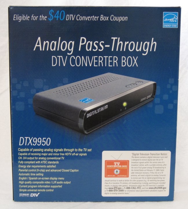 The Digital Stream DTX9950 was popular on some forums early on in the digital TV box race. This unit is available from Radio Shack but my store was out so it needed to be special ordered. It is the smallest in the shootout and has a good sized remote and comes with batteries and a coax cable in addition to the tuner itself. The manual with the box is very comprehensive and covers any questions users might have.