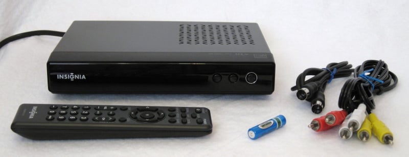 The Insignia NA-DXA1 was Best Buy's store brand digital tuner for over a year. It is now being phased out and replaced with a box from Apex Digital but can still be found at stores that still have some remaining stock or on the Internet as the Zenith DTT901. It is slightly larger than the RCA branded tuner and has a few extra options and buttons but provides a good level of usability for the average user. Other than the tuner, the remote, battery, A/V cable, and coax cable are included.