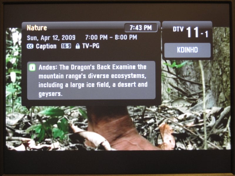 The display button on the remote control brings up the channel information. A static non-transparent display shows the program title, current time, channel designation and call sign, the time of the program, CC availability, lock status, program rating, and extended description. The info screen takes up a good portion of the picture and distracts from the current program, but is easy to read with a lot of information. The main menu has a transparent background, so it was a bit perplexing that this info screen did not.