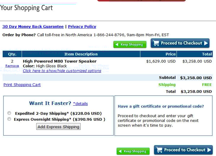 Home Theater Direct: HTD sells speakers, electronics, wiring and whole-home audio products. They don't currently offer free shipping or any customization options, however their speakers come in three lines (literally Level One, Level Two and Level Three). Their products come standard with a satin black or dark cherry finish, which is nice to see. The 30 day trial is pretty standard (if you can’t tell by now), but they will reimburse your original shipping charges and pay return shipping fees in most cases. Read their 30-Day Guarantee for full details about what qualifies a product for free return shipping. HTD's primary disadvantage is name recognition - they don't really have it yet. But, the products we tested from them so far have been solid.