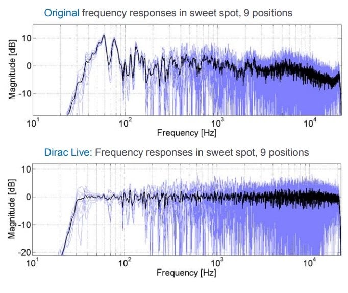 What is more is that the target response that auto-EQ systems aim for can be inappropriate for your room or your speakers, so even if it yields a response close to its target curve, that still may have degraded the sound since it wasn’t right for that room and/or system. Human hearing adjusts to many acoustical properties of its environment so that it can discern a natural sound source within it, and the room response of a sound source will change depending on the room size and level of absorption. Auto-EQ ignores all of that. It assumes that your room and your speakers should behave one way and adjusts the response accordingly. This can make the sound too bright in a large room or too dull in a small room.
