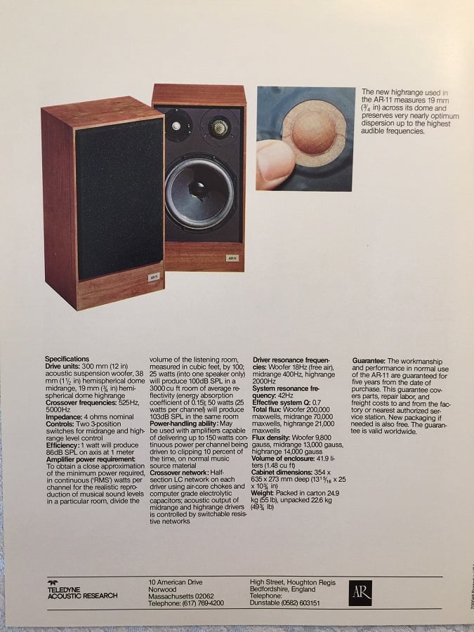 of his AR-1 speakers, and their bass response was superior to those