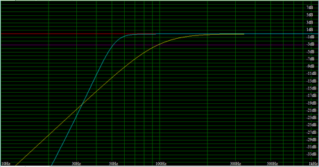 Sealed Rolloff (12 dB/oct, yellow) vs. Vented Rolloff (24 dB/oct, blue)