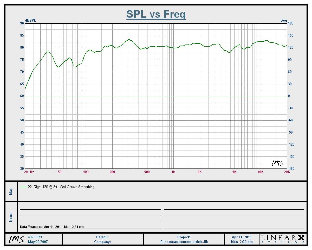 After looking at the graphs, surely most consumers would prefer SPKB because the measurement is much flatter and smoother . Truth be told you are looking at the exact same speaker and the exact same graph. The difference is actually in how I chose to display the data collected, but be assured, the data is exactly the same in both curves. The measurement was taken in-room 8 feet away from my right front reference speaker (RBH Sound T-30LSE). The measurement was not time gated and thus taken steady state so the room influenced the measurement. The only difference between these two above graphs is the dB scaling, which is the vertical axis. The SPK A graph has a 24dB scale in the vertical axis while SPK B has a 120dB scale (known to engineers in the business as the marketing curve). The larger the scale (dynamic range) in the vertical axis, the less detail you see about the measurement. I can't tell you how many so called "professional" reviews I see on other A/V websites and print publications that use 120dB or greater scales to give the illusion of a smooth linear response for the speaker they are reviewing. We personally like to use 60dB scales for all of our loudspeaker measurements and often use smaller vertical scales if we want to zoom in on a problem area. (Most engineers use either a 40 or 50dB log scale for displaying data. This goes back to (possibly precedes) the available parts used in the old analog style graphic level recorders made by the sound measurement company, Bruel & Kjaer).The two most popular potentiometers they sold for audio measurements were 40 and 50 dB. You could even slow the measurement speed down on the old B&K plotters, effectively smoothing the printed plot to yield a nicer looking graph.