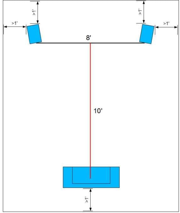 Once in the right locations, you will need to fine tune their positions. Set up the speakers and listening position in a triangle. When the distance between each speaker and the listening position is the same, an equilateral triangle is formed (Fig. A). The diagram below demonstrates this setup, showing a distance of 10’ between each speaker and the listening position, but notice that the listener is really only 8.6’ away. This “golden triangle” is often considered the ideal setup; however, the problem with this arrangement is that the speakers are toed in quite far, which focuses the sound for only one position (‘toe in’ is how far the speakers are angled in). We prefer closer to an 70-80% rule where the speakers are spaced out about 70-80% of the distance to the primary listening position, i.e. you are sitting 10ft from the speakers that are placed 8ft apart (Fig. B). This usually results in less toe in needed and thus more listeners can have a better experience. Ultimately, you will want to experiment with the toe in of the speakers and how far back you sit.