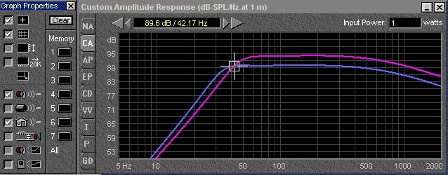 In order to go down to the lower frequency without increasing the box volume, we have had to double the mass of the woofer from 75 to 150 gms, and we have also had to increase the magnet size substantially as the motor force (Gap flux in Tesla times the length of VC wire in meters in the magnetic field) has increased from 16TM to 20TM. (If the truck gets bigger and heavier, you need a bigger engine to move it about). Most importantly, in the search for more bass, we have not only driven up the cost, we have also lost 4db of output at and above 60 Hz! In fact on inspection of the curves, these two systems are equally efficient at 42 Hz, the low note on the bass guitar!