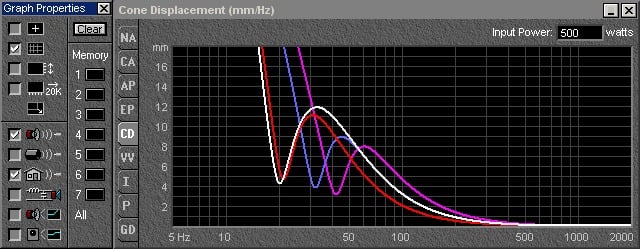 Now in addition to the larger magnet we will need to control the higher moving mass of the heavier woofers, this problem gets exacerbated by the need to move much farther when reproducing ever lower frequencies. Let’s take a look at the Cone Displacement curve of all these woofers, in the same box, driven by the same power. Remember, because of the efficiency differences between these woofers, the same power does not yield the same SPL’s. The heavier speakers are not going to produce the same SPL with the same power applied.