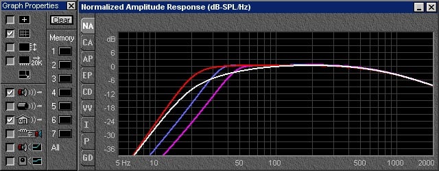 As you can clearly see from the 1 watt curve, there is a 9 db difference in efficiency between the 75 gm and 300 gm woofer in favor of the lighter woofer. Bear in mind also that the 300 gram woofer would have to have a much larger motor on it - (16 TM vs. 24 TM (TM = Tesla*Meters) for the heavier woofer). So not only is the heavier woofer far more expensive to make, it requires 9db more amplifier power relative to the lighter woofer from about 60 Hz up. In short, if the 75 gram woofer has a 100 watt amp, we would need 800 watts for the 300 gram woofer to make similar SPL’s. The woofer shown in the white and blue curve is actually the same speaker in the same box. The difference is the tuning of the box. Without a speaker change, tuning the box lower simply creates a droop in the response. In short, the gains below 30 Hz are paid for by the losses between 30 and 100 Hz.