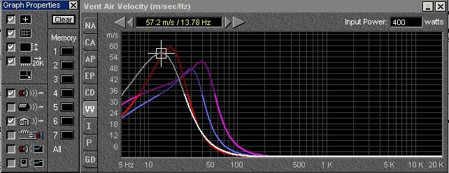 The other issue arising with a lower and lower designed F3 point, is one of dynamic range. Remember the loudness of a sound is not independent of frequency. With human hearing, the lower you go, the more output is needed for a given degree of loudness. So even if I could make a small speaker flat to 20 Hz, how do I get a sufficient dynamic range at that frequency with a limited mechanical travel? Put another way, if my sensitivity has dropped down to 80db for 1 watt, (not much above the threshold of hearing at 20hz) and I need to create 110 db of sound at 20 Hz to have a dynamic range of 30 db at that frequency in my listening room, that means I have to be able to put 1000 watts at 20 Hz into my speaker without it bottoming. Now if the speaker is ported at 20 Hz, I may not be worried about the cone excursion at 20 Hz, but what about the air velocity through the port? Beyond a certain limit, the air from the port becomes turbulent. This can result in both high distortion and literally negative gain from the port, when the air flow goes from being in phase to being out of phase! (I have measured this phenomenon. While I put in more power, the SPL near the port frequency actually goes down!) Now let's look at the vent velocity vs. frequency for the different designs.